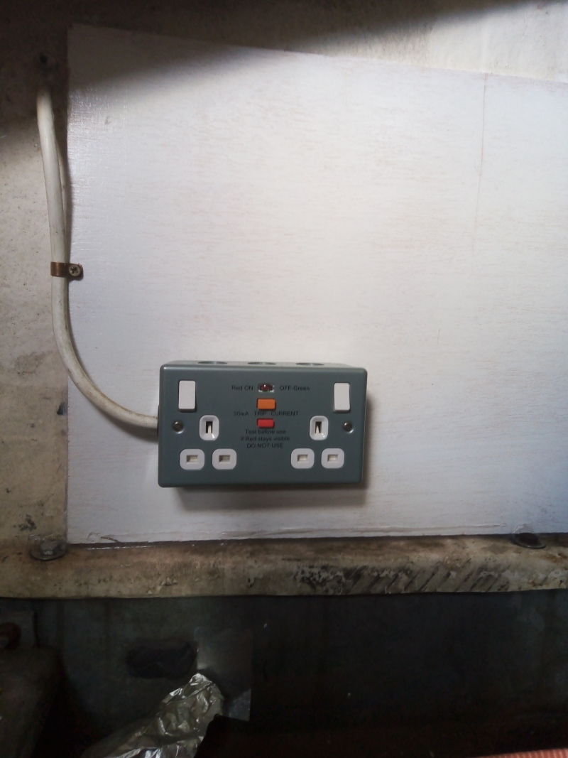 While at a local autojumble, I managed to pick up an external mounted 16A commando socket. I have mounted this on the right hand side of the Pod, as this is the side next to the external 13A sockets of the house. This is ran to a RCD metal clad double socket inside the Pod. It just there if I find I need to charge the car battery (this might be possible off the leisure batteries, need to research this) or the leisure batteries themselves over the winter, if the solar doesn't provide enough. However I don't expect to use much power, apart from running the heater every now and then to keep it working.
