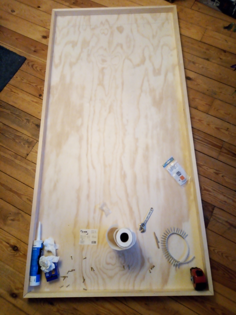 For a table I picked up an old single bed headboard, fitted some strengthening strips underneath and hinged it to the right hand wall. A simple pair of ring eyes and a carabiner held it up and a strut underneath supported it when open. I later on had to modify this as I found the ring eyes broke. So now its held in place by a wooden turn buckle.