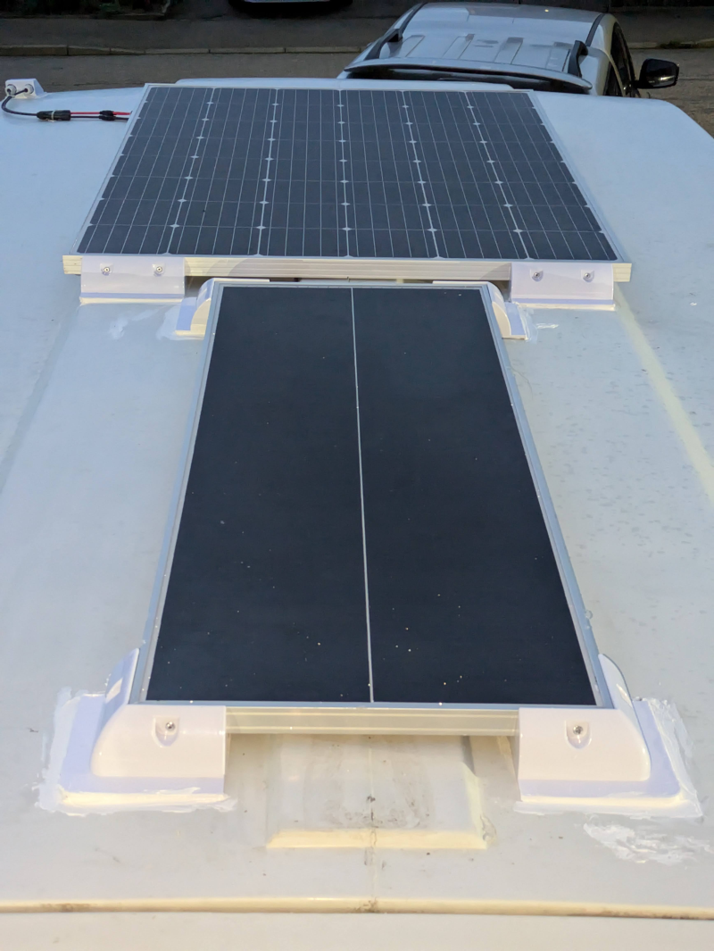 The charge controller maxes out, current wise, at 15A so I get 15A x 18.15v = 272.25Watts total power available. This is loads more than is needed but the weather here can be variable, so more solar is better. This has increased the trailer height by 60mm/2.3" to 2310mm/7' 7.3".